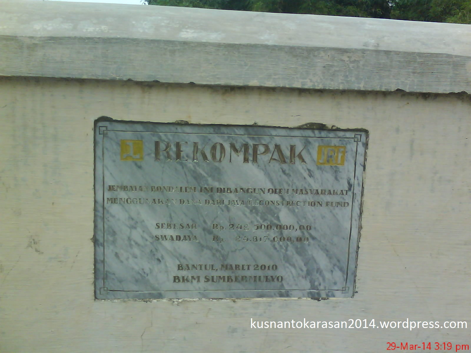 Jembatan ini dibangun oleh masyarakat,juga BKM Sumbermulyo, dengan biaya swadaya sebesar Rp 24.317.000,00 dan atas bantuan dari Java Reconstruction Found sebesar Rp 242.500.000,00
