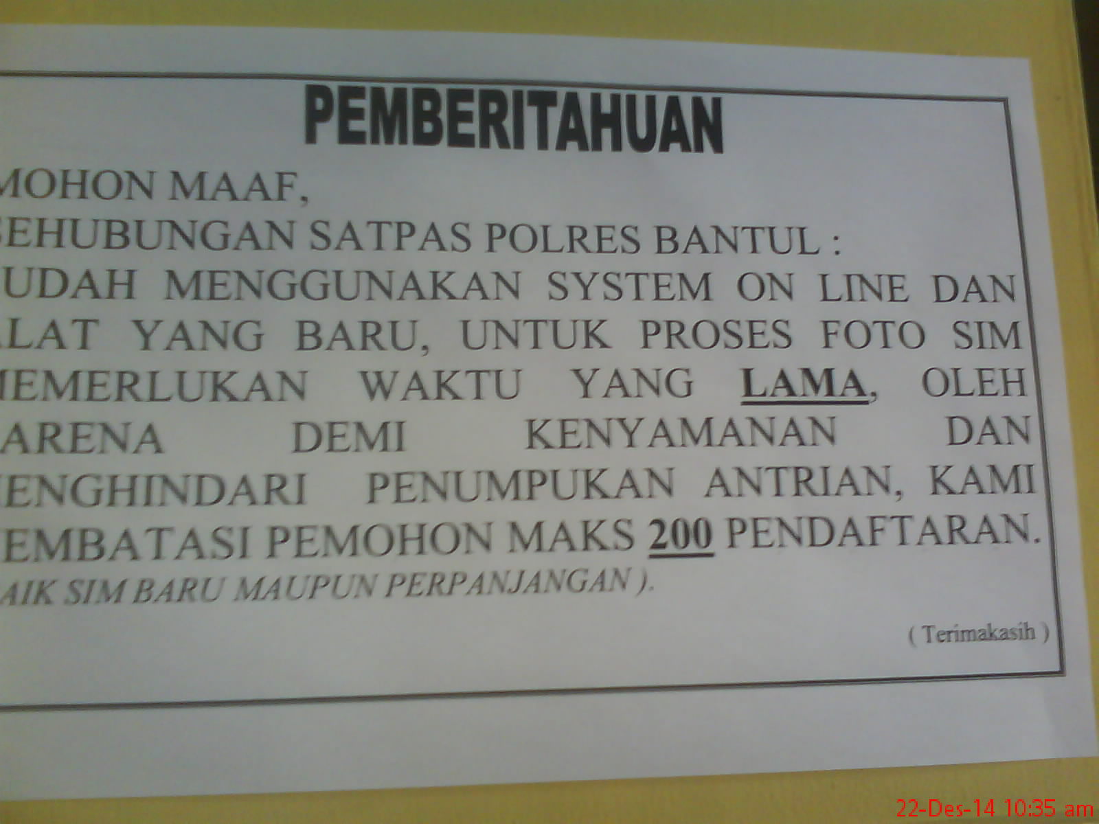 Oiya maaf sebelumnya mas dan mbak sekalian walaupun hal ini seakan sederhana dan sepele, namun berhubung saat saya melihat langsung di TKP, ternyata banyak yang terlihat dan mengalami kebingungan dalam menjalani langkah-langkah dalam mencari /menerbitkan SIM di Bantul, maka saya tuliskan artikel ini, dan maaf pula jika ini hanya terbatas di Polres Bantul saja. Dan ini juga untuk mengurus SIM C ya…!!)
