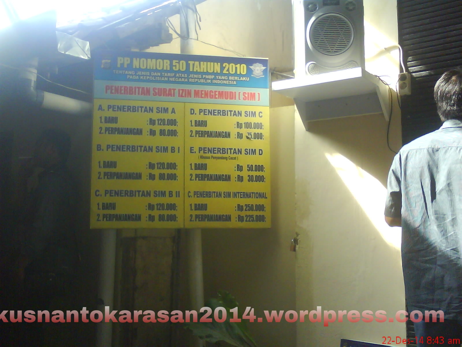 Mas dan mbak sekalian, bagi kita pecinta berkendara, Untuk melegalkan akan berkendara kita di jalanan maka kita membutuhkan suatu ijin berkendara ataupun biasanya di debut mengemudikan, baik Sepedamotor maupun Mobil, roda dua hingga roda banyak, secara resmi kita diwajibkan memiliki suatu surat ijin yang lazim di sebut Surat Ijin Mengemudi atau biasanya disingkat dengan SIM. Nah untuk memperoleh SIM tersebut yang di terbitkan oleh Kantor Kepolisian Republik Indonesia yang berada pada setip daerah tingkat kabupaten, yaitu Satuan Kepolisian Polres, maka kita ya kudu mengunjungi kantor Polisi Resimen/ Polres. dengan syarat mutlak baik laki maupun perempuan adalah yang telah berumur 17 tahun, dan telah memiliki Kartu Tanda Penduduk (KTP).