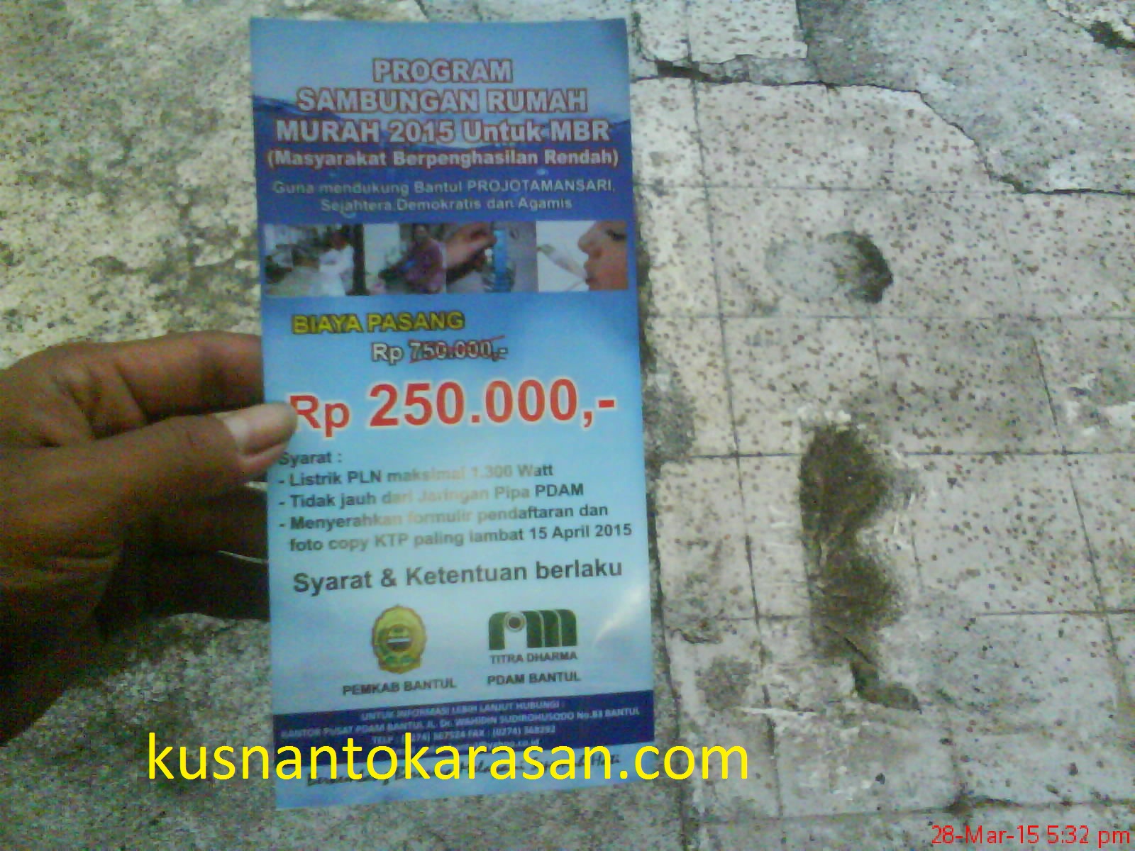Tanpa sengaja membaca sebuah iklan layanan masyarakat, yang sepintas hanya terbaca oleh otakku adalah Rp 250.000,-. Setelah mencermatinya ow ternyata itu adalah suatu Program Sambungan Rumah Murah 2015 Untuk MBR (Masyarakat Berpenghasilan Rendah), Opo meneh iku..setelah mencermati lagi, oh ternyata itu suatu penyaluran air bersih dari Perusahaan Daerah Air Minum Bantul (PDAM Bantul).. nah gamblang sekarang.