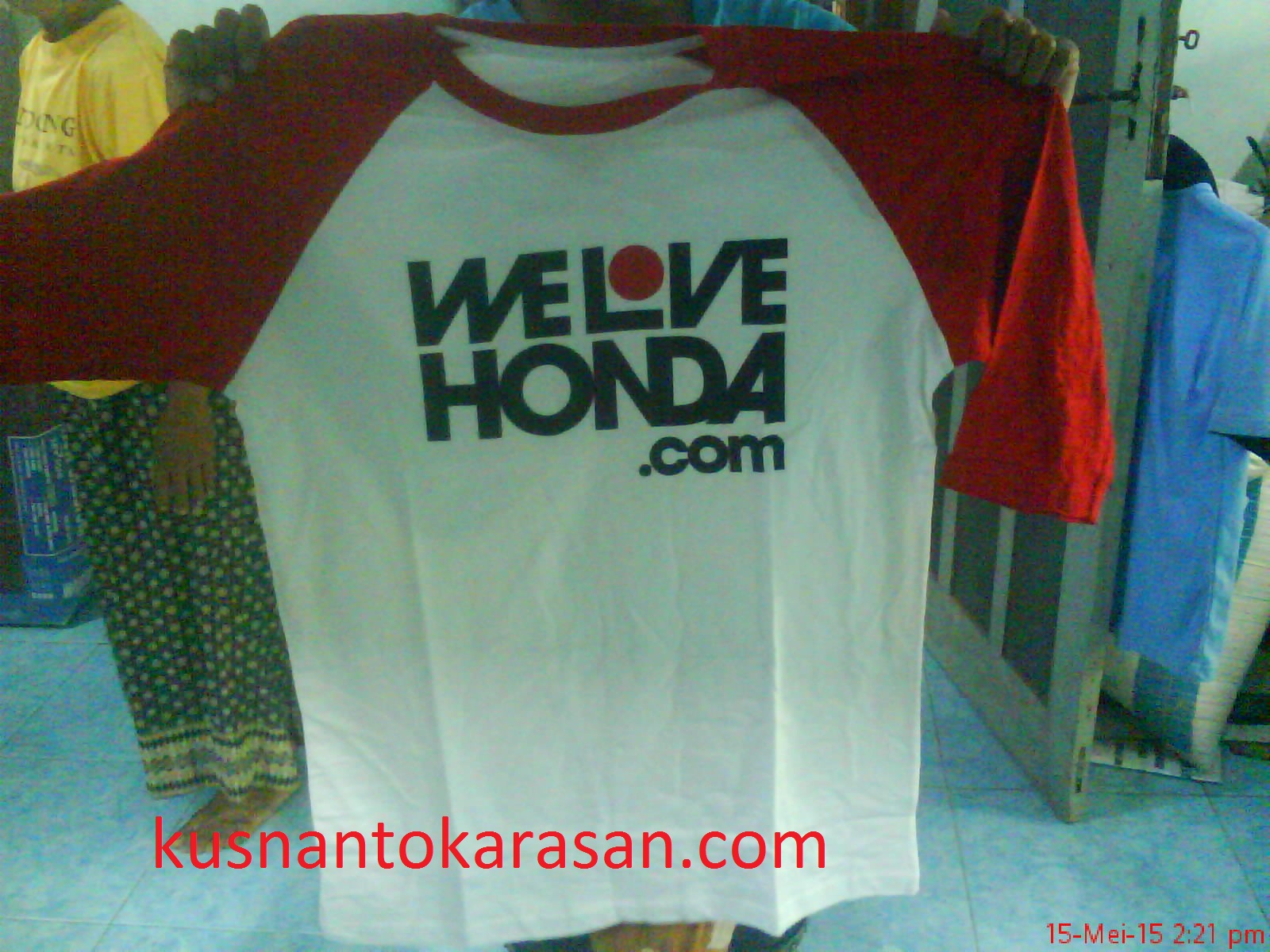 Lansung deh dibukak bungkus plastiknya, yang benar-benar rapat menjaga bungkusan, dengan hati-hati an agak sedikit tidak sabar membuka isi bungkusan, dan benar tebakan isinya , sebuah T-shirt/kaos oblong bahan katun warna putih dengan warna pundak dan lengan terusan warna merah, ukuran lengan 3/4, Alhamdulillah. Kaos didepan bertuliskan welovehonda.com dan belakang bertuliskan logo sayap honda one heart, duh senengnya my heart.