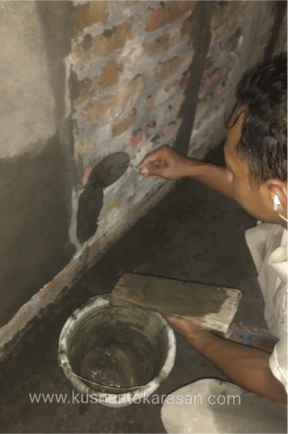 Direkatkan, cara menempelkan mortar ke tembok saat proses plester.