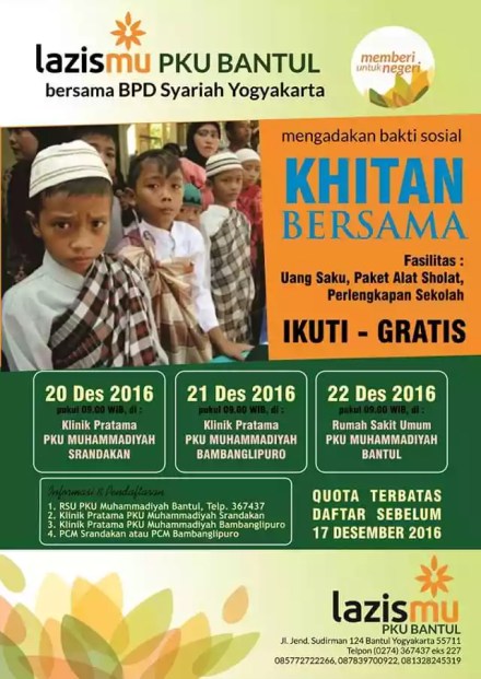 Kembali lazismu PKU Bantul mengadakan bakti sosial , kali ini bekerja sama dengan BPD Syariah Yogyakarta mengadakan bakti sosial ‘Khitan Bareng’. Untuk tahun 2016 ini akan diselenggarakan pada tanggal 20,21,22 Desember, di RSU & Klinik Pratama PKU Muhammadiyah BANTUL, Bambanglipuro dan Srandakan.