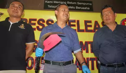 Barang bukti sajam yang di sita dari tersagka KM yang di tunjukkan oleh AKP Anggaito