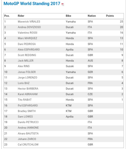 Setelah merajai dalam beberapa sesi uji-coba pramusim, akhirnya Maverick Vinales berhasil finish dan menang untuk seri perdana di atas motor Yamaha. Kemenangan yang tidaklah mudah, karena ada penunggang Ducati – Andrea Dovizioso disana juga rekan satu teamnya sang legenda Valentino Rossi.