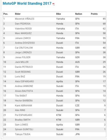 Klasemen sementara MotoGP setelah balap Perancis 2017
