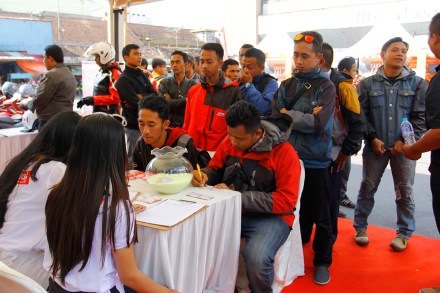 Pengunjung roadshow New Honda Supra GTR 150 melakukan registrasi sebelum melakukan riding test motor Honda dengan konsep sport touring bermesin DOHC 150cc di Magelang Theater (24/5).