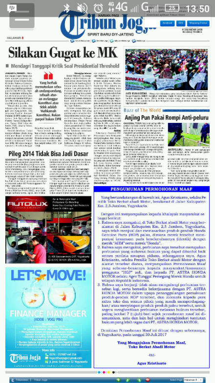 Menyampaikan permohonan maaf (26/7/2017) secara terbuka melalui media cetak (tribunjogja edisi Kamis, 27 Juli 2017 cetak/epaper)
