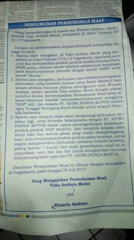 Permintaan maaf secara terbuka ini disampaikan oleh keduanya kepada masyarakat/konsumen dan PT. Astra Honda Motor AHM, selaku Agen Tunggal Pemegang Merk Honda, yang mana kedua toko tersebut yang telah menjual dan memasarkan produk Honda Genuine Part(HGP) palsu, dimana merk tersebut mempunyai kesamaan pada keseluruhannnya (identik) dengan merk ‘AHM’ serta merk ‘Honda’.