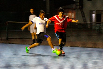 Salah satu pemain PEMC (merah) mengecoh lawannya dalam duel final Ketupat Futsal Community Cup. Laga final yang mempertemukan PEMC dan PHCC dimenangkan oleh PEMC dengan skor yang meyakinkan yaitu 6-3.