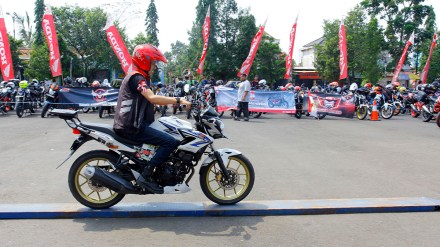 2. (1, 2, Masing-masing komunitas Honda CB150R Streetfire mengirimkan wakilnya untuk adu ketrampilan dalam sesi balancing ride fun game. Dengan menggunakan fasilitas narrow plank peserta berkompetisi untuk beradu durasi menjaga keseimbangan masing-masing.)