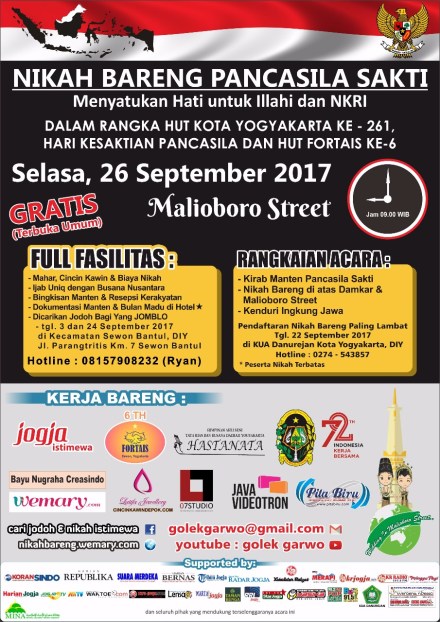 Nikah Bareng Pancasila Sakti akan diselenggarakan pada hari Selasa jam 09.00 pagi – 26 September 2017. Acara ini merupakan hajatan rutin dari FORTAIS yang di gawangi oleh pak RM Ryan Nuryanto, dalam rangka HUT kota Yogyakarta ke-261, hari Kesaktian Pancasila serta HUT FORTAIS ke-6.