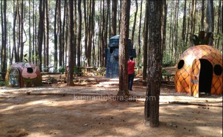 Well, lanjut treknya menyusuri jalan setapak diantara pepohonan pinus. Kembali kita menemui ada area rehat, kali ini cukup menyita perhatian anak-anak tentunya, karena ada tiga bentuk rumah-rumahan seperti rumah nya spongebob, squidword dan patric yang di film kartun spongebob squarepant itu.