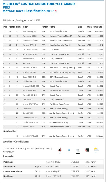 Dan berikut Klasemen sementara MotoGP setelah seri Philip Island Australia ;