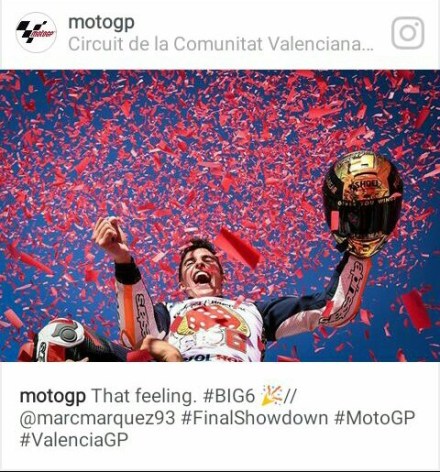 Meskipun diseri terakhir kemarin Marquez tidak juara (finish ketiga) karena dimenangkan oleh rekan setimnya Dani Pedrosa , lalu Johan Zarvo kedua. namun karena dia memperoleh poin tertinggi pada seri sebelumnya yakni 282, selisih 21 poin dengan peraih poin tertinggi kedua yakni Andrea Dovizioso dengan 261. Di seri Valencia kemarin Marquez finish ketiga dan mendapat poin 16, maka total 298 poin yang diraihnya selama musim ini maka dia meraih gelar juara dunia untuk ke enam kalinya.