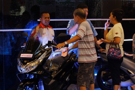 Salah satu sales people Honda memberikan penjelasan mengenai berbagai fitur canggih yang disematkan dalam All New Honda PCX 150.