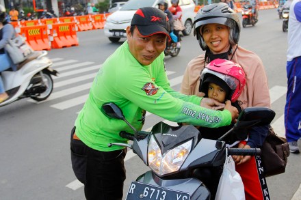 Salah satu anggota komunitas memasangkan helm dalam kampanye keselamatan berkendara yang dihelat secara terintegrasi dengan agenda Vario Smart Fest.
