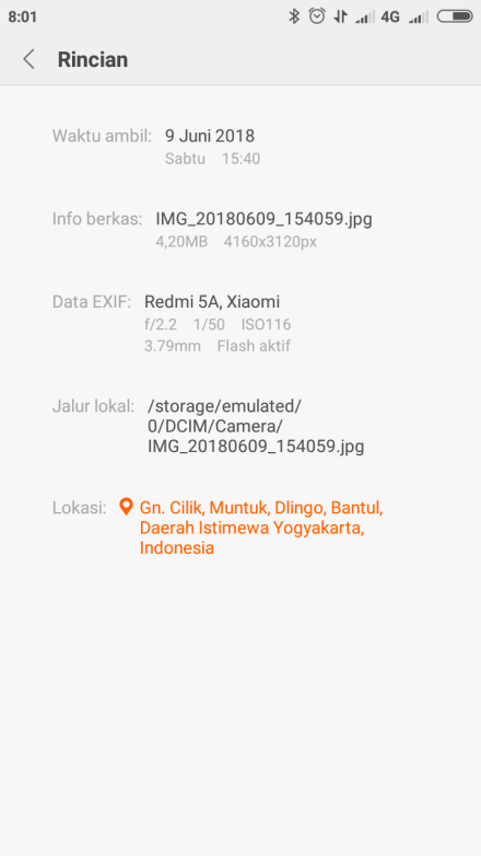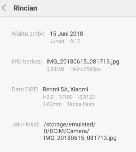 Berikut rinciannya : ukuran 2,23MB 4160x3120px, data exif: Redmi 5A, Xiaomi f/2.2 1/13 ISO1280 3.79mm tanpa flash