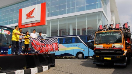 Perwakilan Manjemen PT Astra Honda Motor, Astra Motor Head Office, dan Astra Motor Yogyakarta melepas keberangkatan 360 pemudik dari Yogyakarta dan sekitarnya di dalam Balik Bareng Honda 2018 (19/6). Seluruh peserta diberangkatkan menggunakan 10 bus ekslusif dan 150 sepeda motor milik peserta dikirim menggunakan 3 truk ekspedisi.