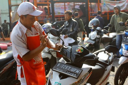 Salah satu mekanik Honda yang bertugas mempersiapkan sepeda motor milik peserta Balik Bareng Honda 2018 untuk diangkut menggunakan truk ekspedisi menuju Jakarta.
