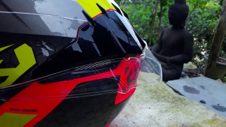 - Aerodinamic Visor Lift / Drop Switch For Inner Visor ( visor yang aerodinamis dengan tombol untuk menyingkap atau menurunkan visor sisi dalam)