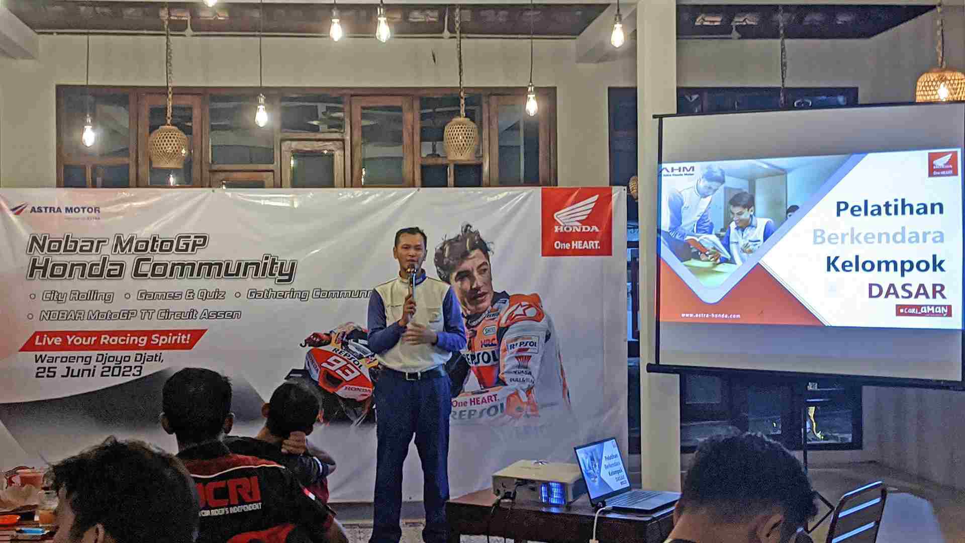 Sebagai pemanasan Kompetisi Safety Riding Regional Honda Community 2023 dibuka dengan penjelasan mengenai Honda Community ID dan pengenalan Astra Motor Safety Riding Center Yogyakarta. Setelah itu seluruh peserta langsung mengikuti sesi penilaian teori Safety Riding.