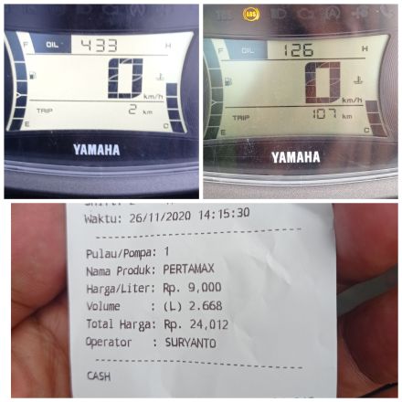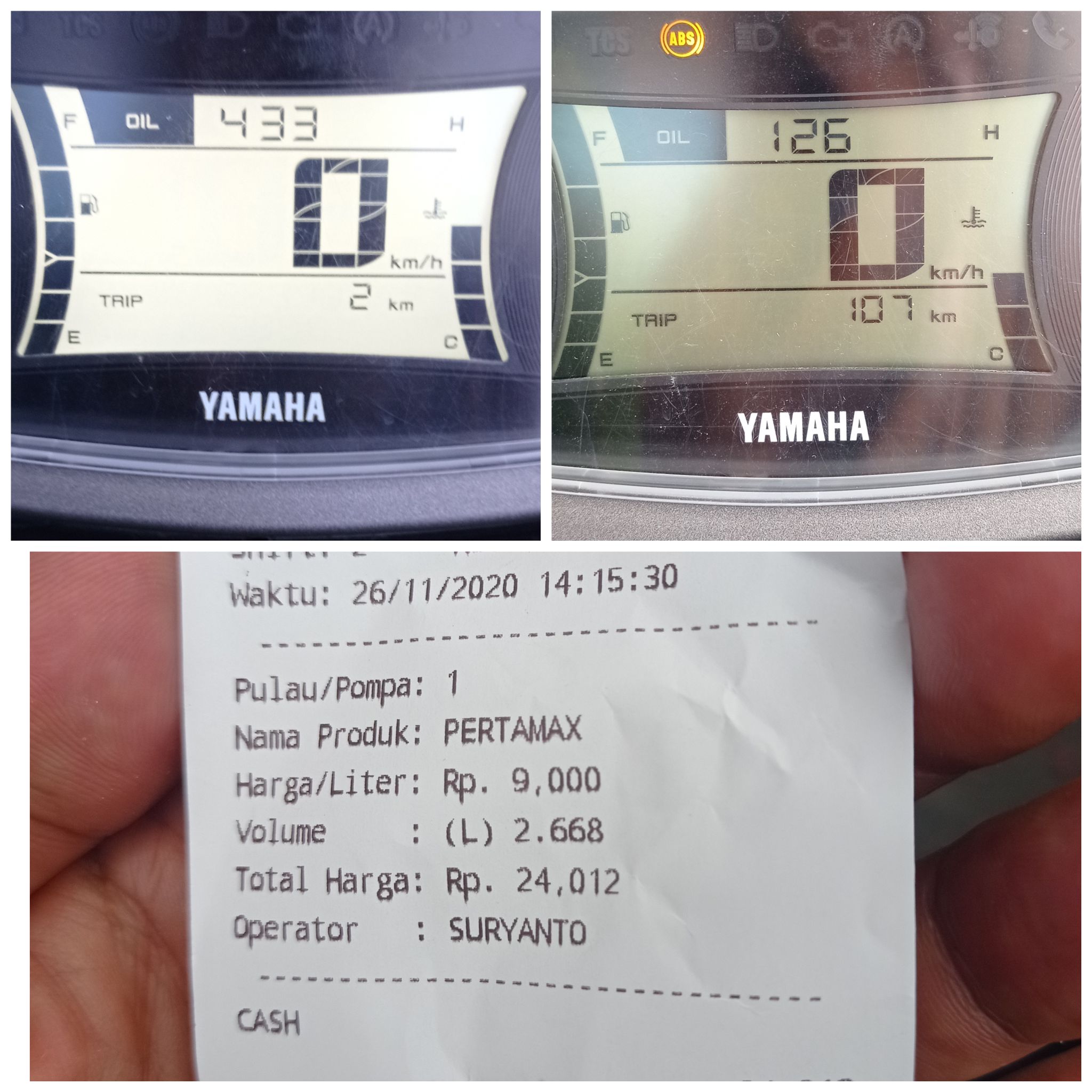 well, sekarang kita itung konsumsi bahan bakar nya ya, yang mana sesuai perbandingan kompresi yakni menggunakan BBM jenis Pertamax. Metode yang mbah-kus gunakan adalah full to full, jadi awalnya motor diisi penuh BBM dan dicatat/ difoto pada angka berapa, kemudian digunakan, lalu diisi ulang hingga penuh juga, dicatat dan dikalkulasikan, (kilometer akhir dikurangi kilometer awal dibagi BBM yang diisikan. Mbah lakukan itu sebanyak dua kali, dua kali. pada pengujian pertama penggunaan awal pada titik kilometer 2, setelah dipakai beberapa waktu dan beberapa jauh kemudian diisikan lagi BBM hingga penuh pada kilometer 107, pengisian BBM sebanyak 2,668 liter(dibulatkan saja ke 2,6) , jadi jika dikalkulasikan (107-2= 105, 105:2,6=40, 38, jadi untuk pengujian pertama ketemu 40,38 Km/l.