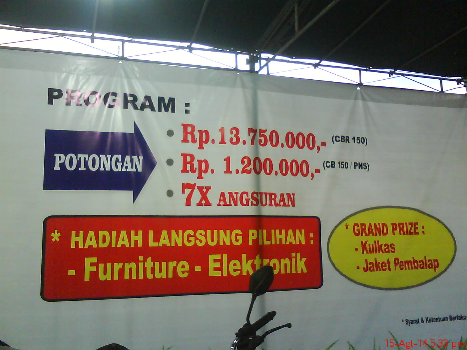 Kini di bulan Agustus 2014, lebih gila lagi, PT. Bantul Motor Wahana Maju* sebagai salah satu dealer terbesar di Bantul memberi potongan harga hingga Rp 13.750.000(13juta 750ribu rupiah) dari harga yang masih sama di bulan Juni. Ayoo buruan mas-mbaj sekalian warga Bantul, jika anda ingin memboyong motorsport dari honda yang sudah tidak diragukan lagi teknologinya-kualitasnya bukan….dan sekarang mumpung sedang ada di stan pameran Bantul Expo 2014 juga, banyak hadiah langsung jika anda membeli disana, juga potongan service dan harga sukucadang juga…monggo !