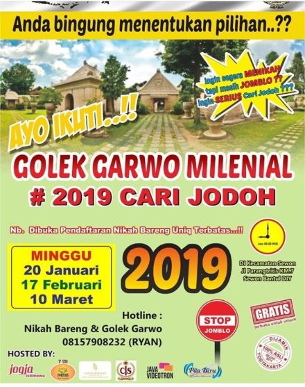 Bagi yang mencari informasi seputar jadwal acara Golek Garwo a k a Cari Jodoh untuk bulan ini (Oktober) memang gak ada atau di liburkan oleh pihak panitia ( Fortais). Tapi jangan bersedih duhai para pencari cinta, karena bulan depan atau bulan November akan diadakan lebih spesial. Karena diadakan di Hotel Satoria, 3 November mendatang. Dikarenakan kuota terbatas, maka calon peserta “Golek Garwo” periode 3 November 2019 di Hotel Satoria, diharapkan untuk mengisi formulir pendaftaran terlebih dahulu.