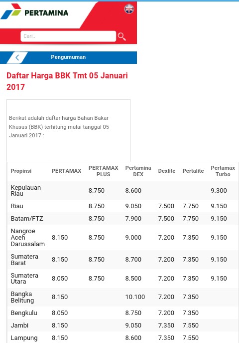 Sumber : http://pertamina.com/id/news-room/announcement/daftar-harga-bbk-tmt-13-januari-2018