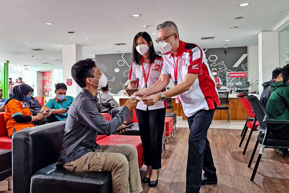 “Langsung melayani pelanggan, menyapa pelanggan dan membagikan gift di ruang tunggu, hingga mengunjungi pelanggan setia Honda di tempat kerjanya merupakan bentuk terima kasih dan kebersamaan kami dengan pelanggan. Terima kasih tetap Satu HATI dan setia bersama Honda.” ujar Ronny Agustinus.
