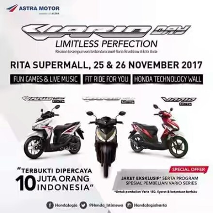 Beragam pilihan sepeda motor yang disediakan untuk menemani beragam gaya hidup serta kesenangan berkendara masyarakat Tanah Air tersebut dapat dijumpai pengunjung pameran pada booth Honda – Indonesia Convention Exhibition, BSD City, Tangerang selama 10 hingga 20 Agustus 2017.