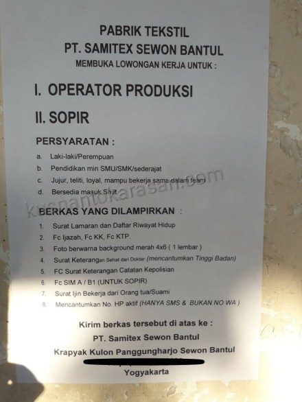 Nah bagi rekan-rekan khususnya domisili Bantul dan sekitarnya yang ingin bekerja di PT Samitex bisa segera mendaftar… Dan berkas langsung di bawa atau dikirim ke PT. Samitex d/a Krapyak Kulon Panggungharjo Sewon Bantul Yogyakarta.